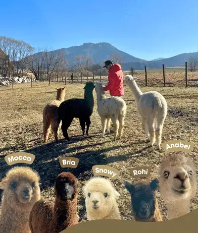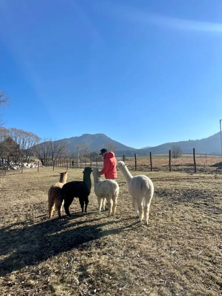 Rande s alpakami: Kŕmenie vo výbehu s doprovodom a výkladom – bezpečný kontakt so zvieratami. Platí 1x za pobyt pre každú osobu v rezervácii.
