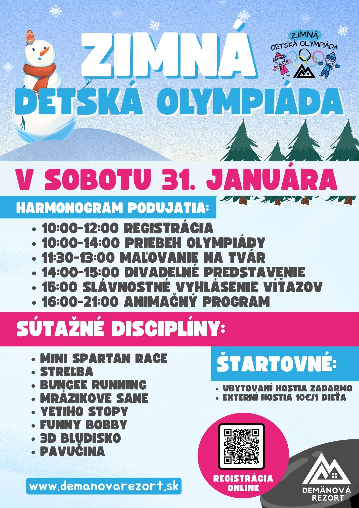 Pozývame k nám všetky detičky od 3 rokov a ich rodičov na skvelú zimnú olympiádu! Olympiády sa môžu zúčastniť hostia ale aj verejnosť. A čo je najlepšie? Štartovné pra našich hostí je úplne ZDARMA! Externí hostia sa môžu zúčastniť za poplatok 10 €.