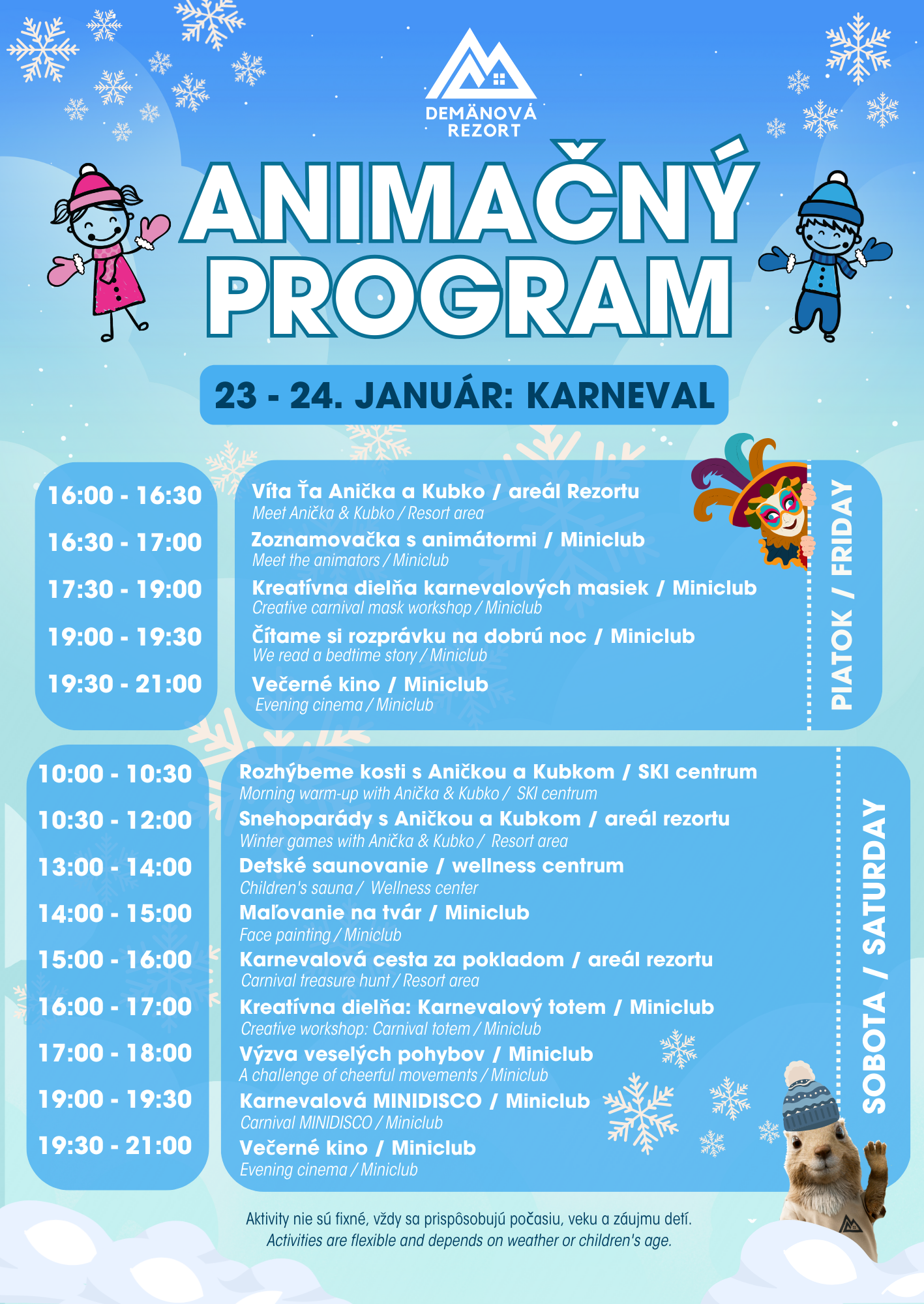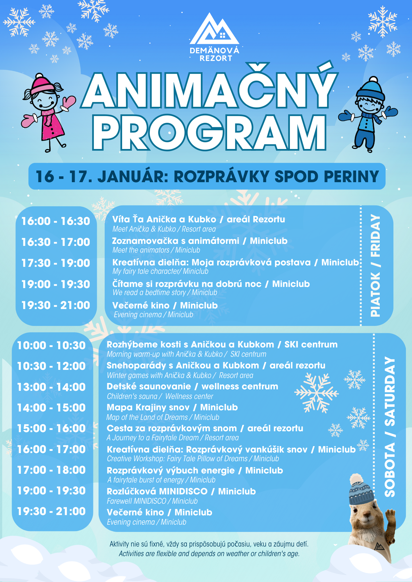 Z dôvodu vysokej obsadenosti začína počas nasledujúceho týždňa (pondelok – štvrtok) každodenný animačný program. Animácie budú prebiehať každý deň v čase od 16:00 do 21:00, s výnimkou nedele. Víkendové animácie (piatok-sobota) budú pokračovať v štandardnom režime. Naše bombastické animátorky sa tešia na všetky deti! Každý víkend sa animácie nesú v duchu nejakej zaujímavej témy, príďte a zistite, ktorá téma sa vašim deťúrencom bude páčiť najviac.