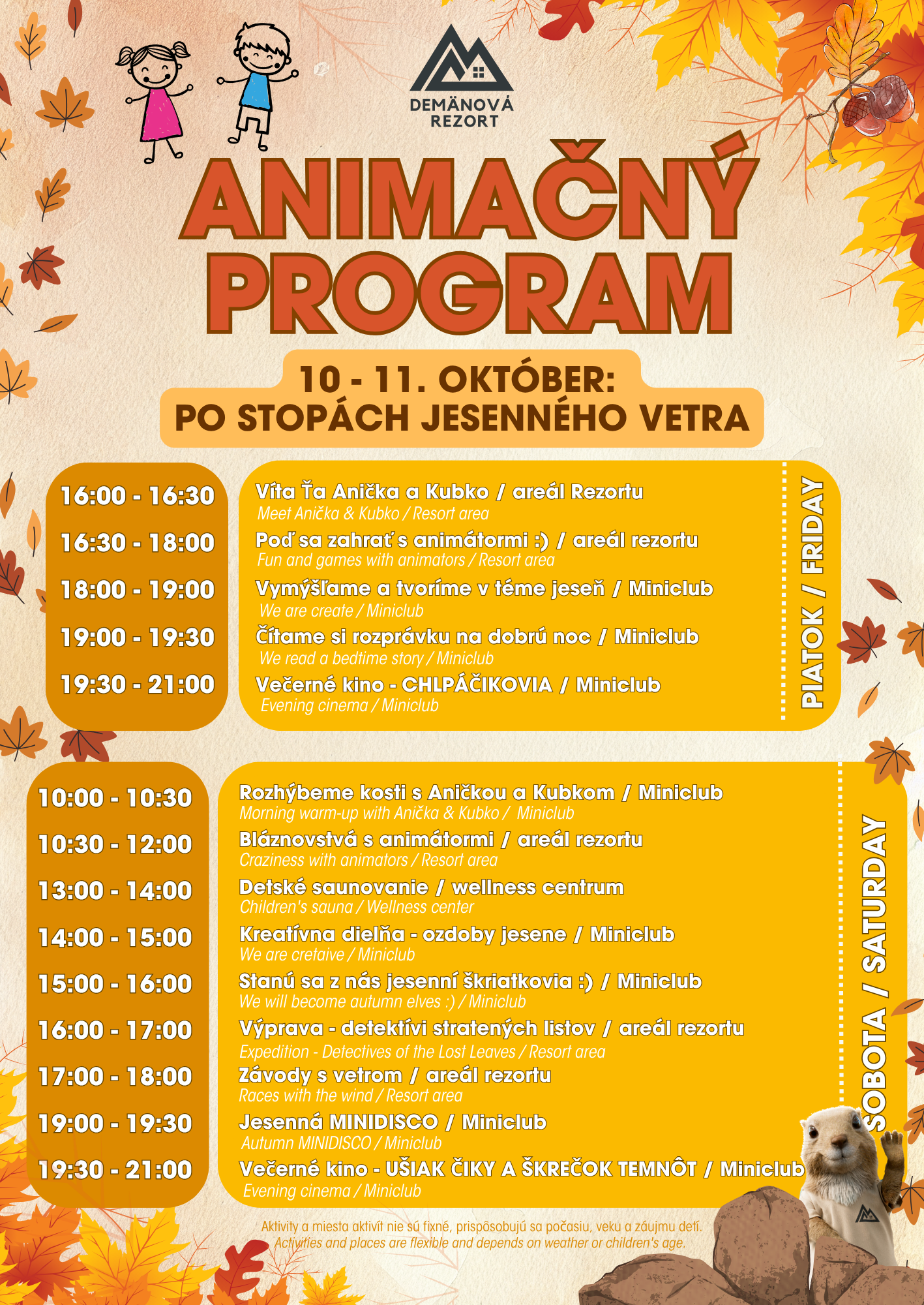 Animácie prebiehajú v miniklube Pinusáčik (vchod z reštaurácie Pinus) a v príjemnom počasí aj na vonkajších ihriskách. Zatiaľ čo sa detičky vyhrajú v miniklube s animátormi, vy si môžete v pokoji vychutnať večeru či drink v Pinuse či Safrane. No neznie to ako fajn plán?