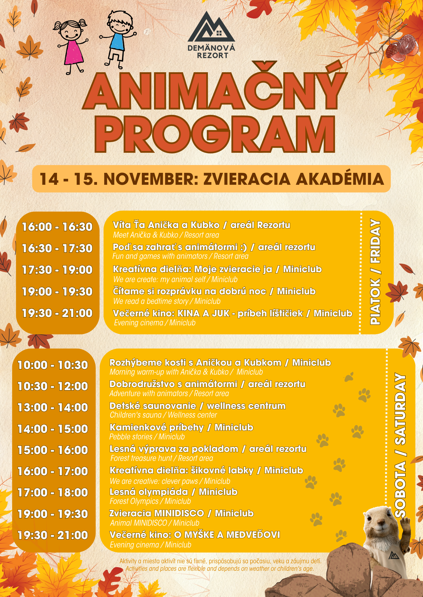 Animácie prebiehajú v miniklube Pinusáčik (vchod z reštaurácie Pinus) a v príjemnom počasí aj na vonkajších ihriskách. Zatiaľ čo sa detičky vyhrajú v miniklube s animátormi, vy si môžete v pokoji vychutnať večeru či drink v Pinuse či Safrane. No neznie to ako fajn plán?