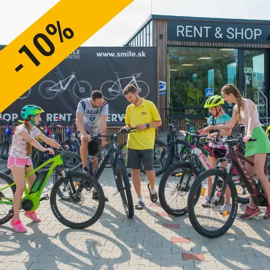 Ako naši hostia máte v požičovni SMILE zľavu 10% na prenájom e-biku či klasického bicykla. Stačí sa vám pri platbe preukázať hotelovou kartičkou, v prípade online rezervácie zadajte zľavový kód, ktorý vám príde v predpobytovom maile od nás.