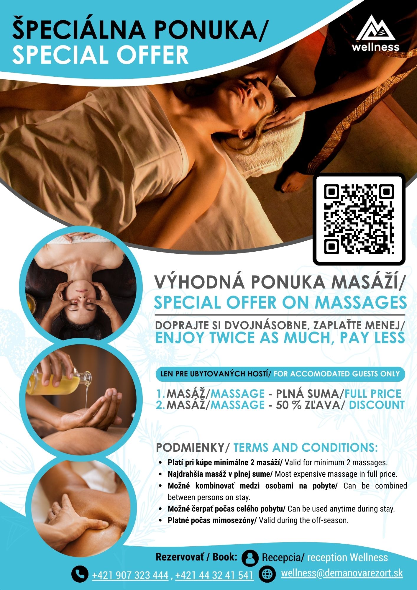 Pri kúpe 2 masáží počas pobytu získate zľavu. Najdrahšia masáž je vždy účtovaná v plnej výške, ďalšia a zároveň lacnejšia masáž s 50 % zľavou. Masáže je možné ľubovoľne kombinovať a využiť aj pre viac osôb. Nie je potrebné absolvovať ich v jeden deň, čerpať ich môžete kedykoľvek počas pobytu. Ponuka je platná počas mimosezóny len pre ubytovaných hostí. Rezervácia a úhrada prebieha výhradne na recepcii wellnessu.