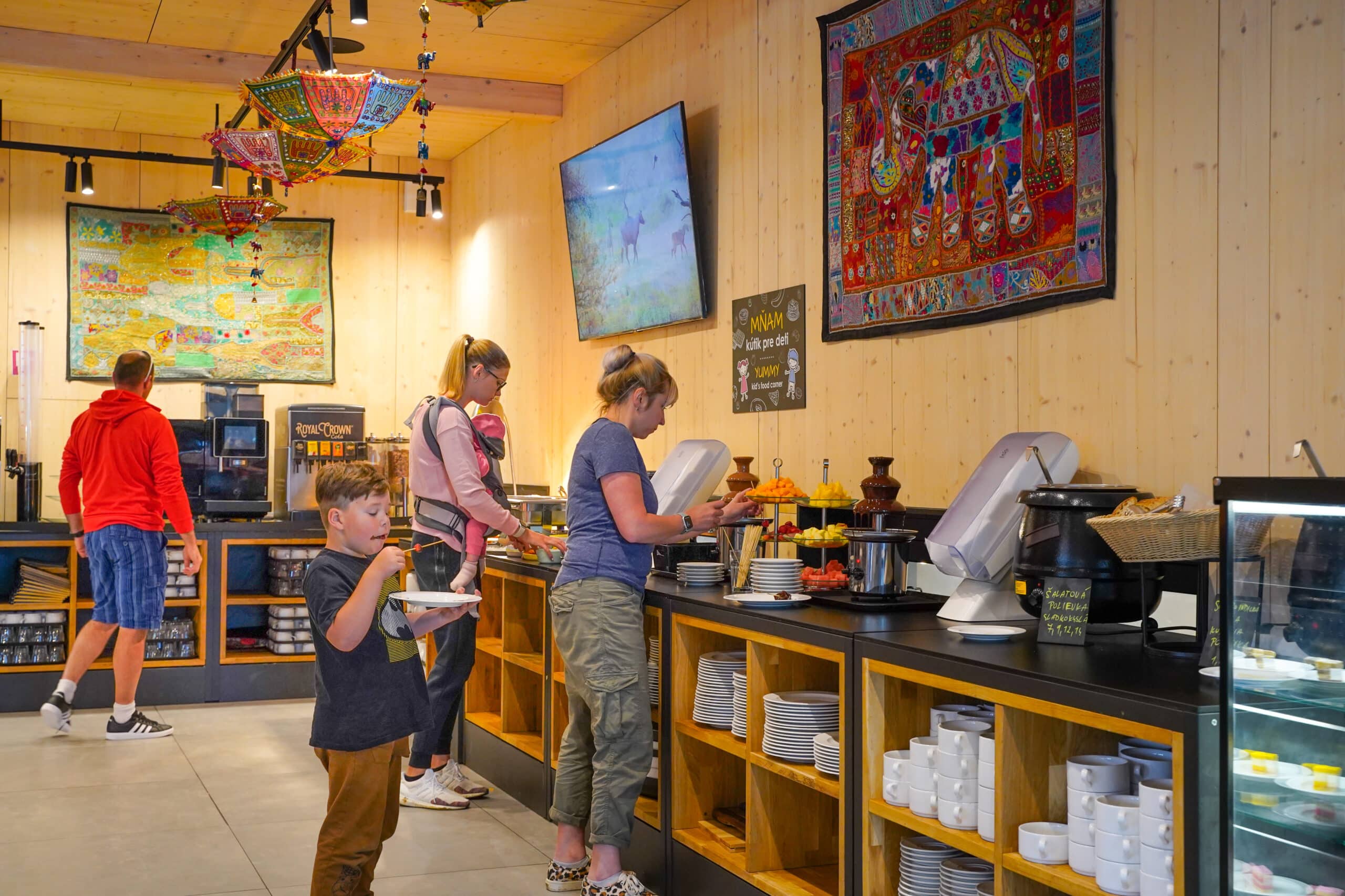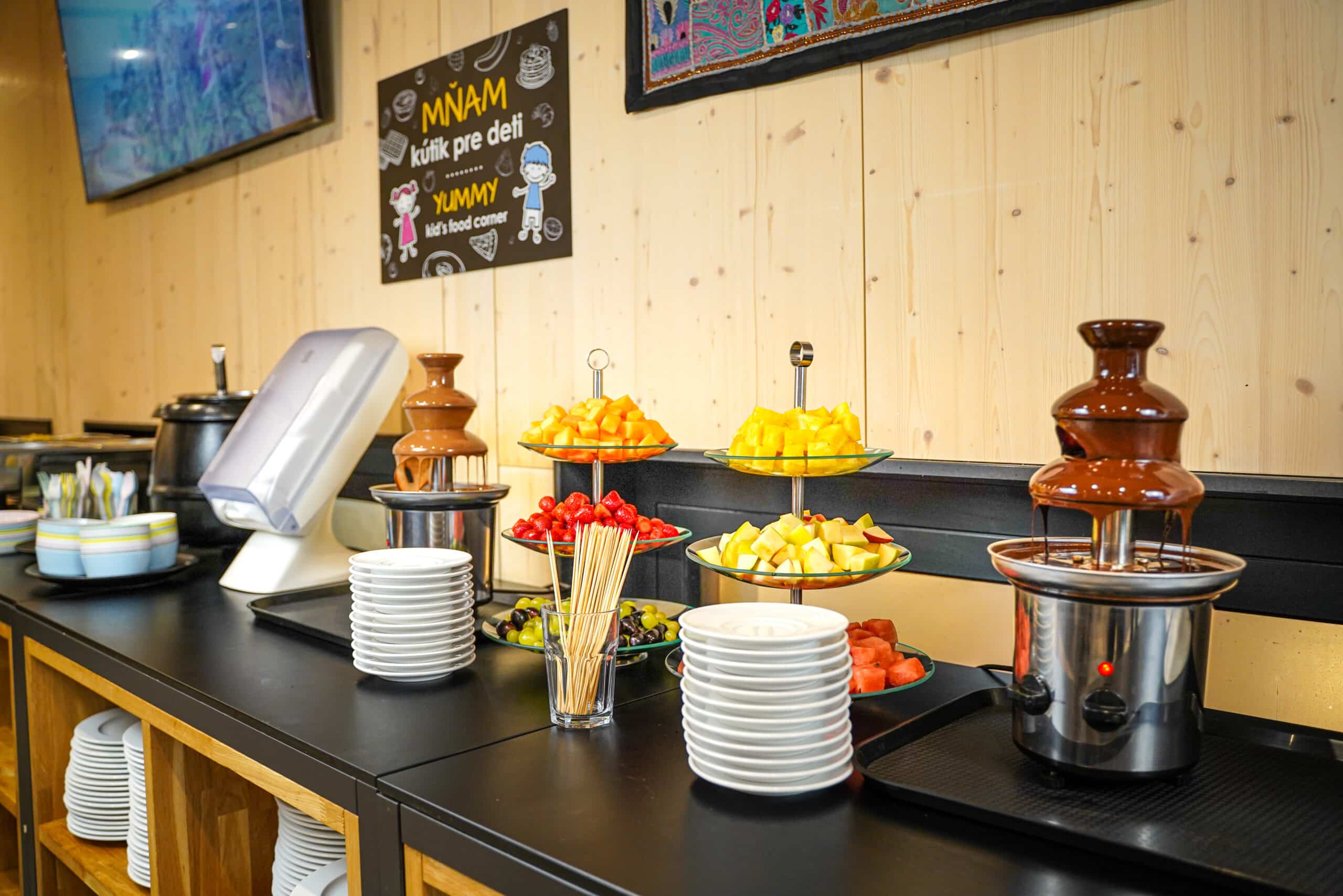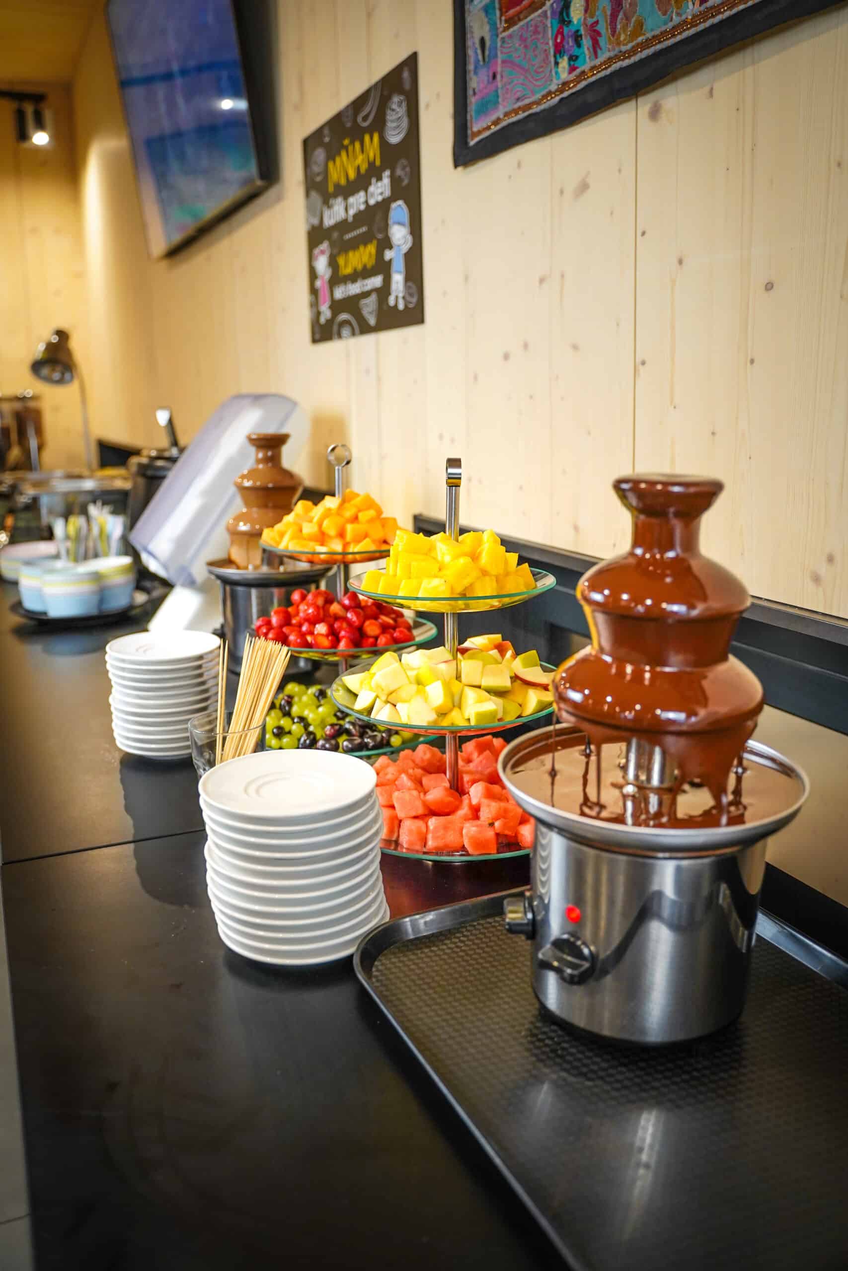 V sezóne počas bufetových večerí si môžete s deťmi vychutnať čokoládovú fontánu s ovocím a masrhmallow.