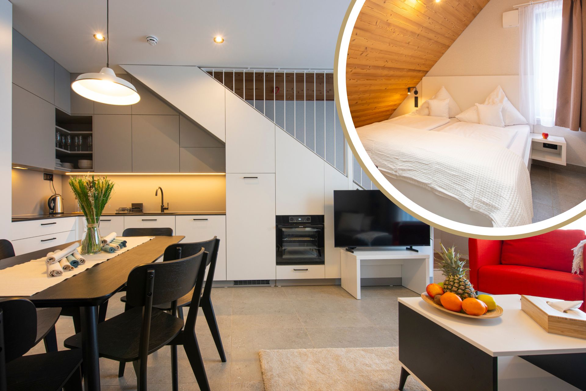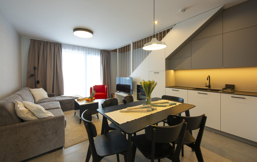 Apartmán Family Suite predstavuje jednu z najpriestrannejších možností ubytovania v rezorte. Päťizbová dispozícia s loftom a dvomi spálňami na poschodí je ideálna pre veľké rodiny alebo viacgeneračné pobyty. Je vhodný pre väčšie rodiny alebo hostí, ktorí chcú vo svojom pobyte cítiť extra pohodlie — či už pri každodennom relaxe, alebo pri spoločnom trávení času.
