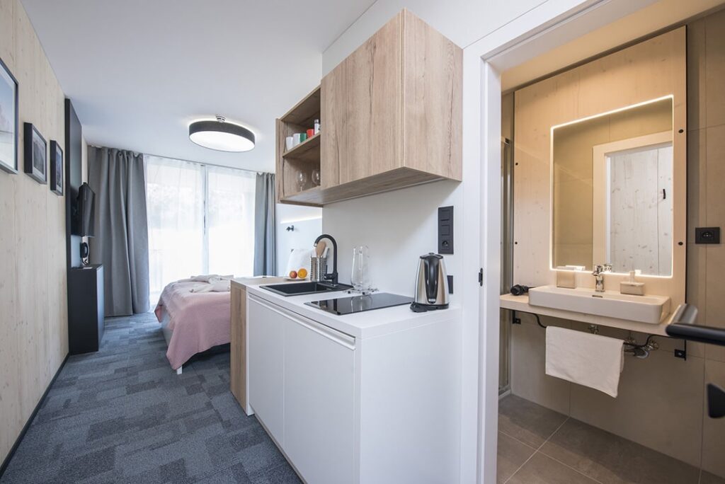 Každá kuchynka má rýchlovarnú kanvicu, mikrovlnnú rúru, indukčnú varnú dosku, hrnce, panvice, dosku na krájanie, strúhadlo, hrnce, naberačky, lyžice, nože. Tiež sadu tanierov a príborov, sadu pohárov, šálky. Prostriedok na umývanie riadu, utierka na riad, hubka na riad. Tiež soľ, cukor, čierne korenie. V každom byte je k dispozícii aj chladnička.