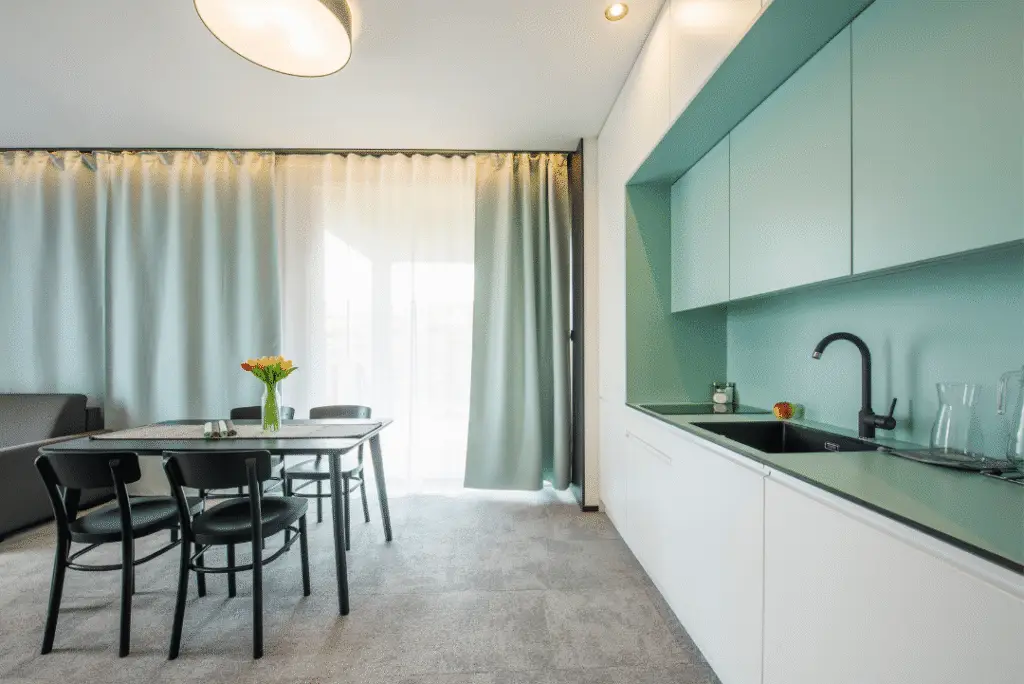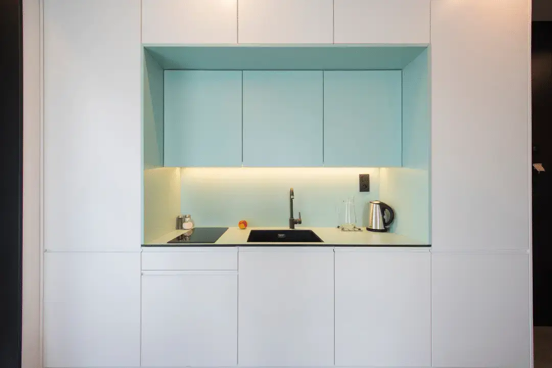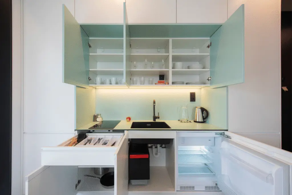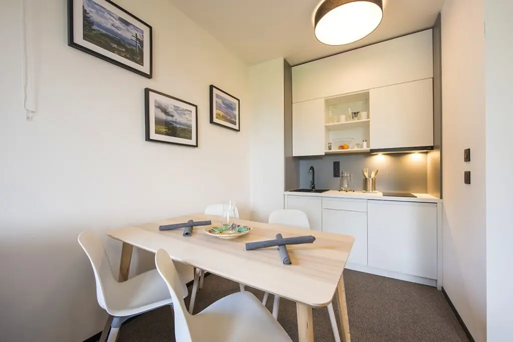 Každá kuchynka má rýchlovarnú kanvicu, mikrovlnnú rúru, indukčnú varnú dosku, hrnce, panvice, dosku na krájanie, strúhadlo, hrnce, naberačky, lyžice, nože. Tiež sadu tanierov a príborov, sadu pohárov, šálky. Prostriedok na umývanie riadu, utierka na riad, hubka na riad. Tiež soľ, cukor, čierne korenie. V každom byte je k dispozícii aj chladnička.