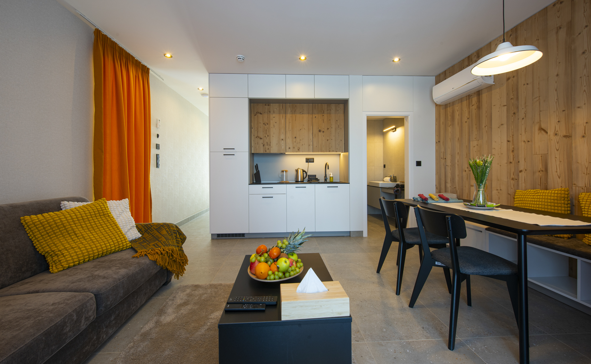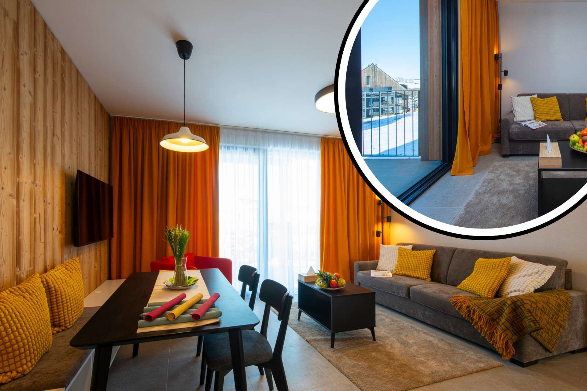 Je zariadený tak, aby ste sa tu cítili ako doma — s plne vybaveným kuchynským kútom, obývacou zónou a pohodlnou spálňou. Okrem manželskej postele poskytuje obývacia časť s gaučom ďalšie možnosti spania a vytvára príjemné miesto na spoločné chvíle. Klimatizácia zabezpečuje komfort počas celého roka. Panoramatické výhľady z terasy umocnia pocit oddychu a pokoja, ktorý je základom každého pobytu v Demänová Rezorte. Apartmán je vďaka polohe hneď pri zjazdovke SKI IN & SKI OUT – z izby rovno na svah.