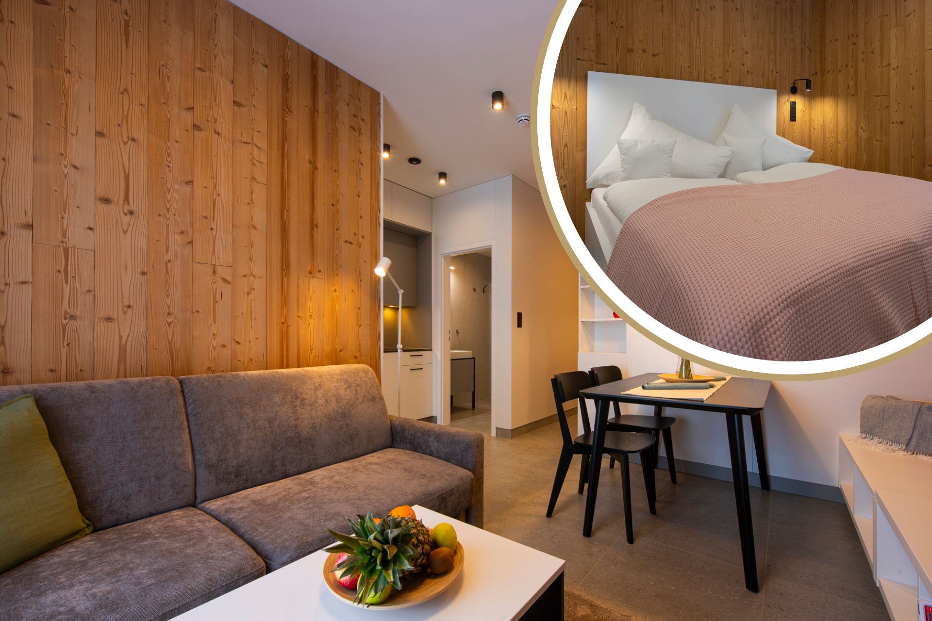 Spálňa s manželskou posteľou (160 cm) je doplnená o obývaciu časť s gaučom, ktorý slúži ako plnohodnotná prístelka. Medzi spálňovou a obývacou časťou je zástena. Dominantou apartmánu je rozľahlá terasa so sedením. Apartmán je vďaka polohe hneď pri zjazdovke SKI IN & SKI OUT.