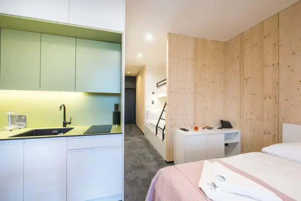 Apartmán SMART FAMILY je štandardný 1-izbový apartmán pre dve osoby obohatený o ďalšie dve lôžka. Je tak vhodný pre 4-člennú rodinku, ktorej stačia útulnejšie priestory.