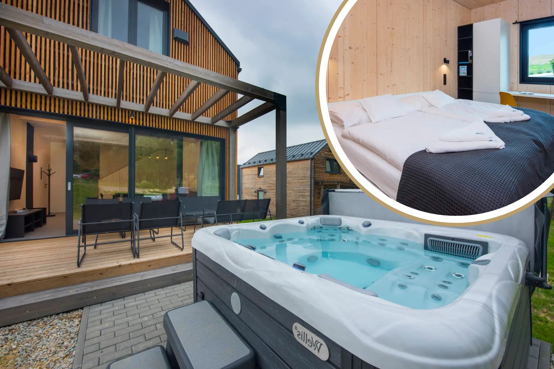 Vila Luxury je samostatne stojaca, priestranná chata s privátnou vírivkou na terase. Vďaka jej veľkosti je vhodná až pre 12 osôb, ktorí sa pohodlne vyspia na 8 pevných lôžkach a 4 prístelkách. K dispozícii sú 3 spálne, obývačka, 2 kúpeľne so sprchovými kútmi a dvomi oddelenými toaletami.